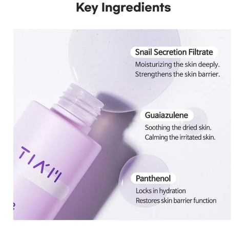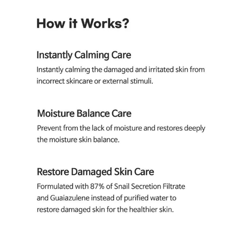 Snail Secretion Filtrate(87%), ButyleneGlycol, Glycerin, Hydroxyethylcellulose, PEG-40 Hydrogenated Castor Oil, Beta-Glucan, Saccharomyces/Viscum Album (Mistletoe) Ferment Extract, Betaine, Allantoin, Panthenol, Chlorphenesin, Lactobacillus/Soybean Ferment Extract, AnthemisNobilis Flower Extract, Saccharomyces/ Imperata Cylindrica Root Ferment Extract, Disodium EDTA, Sodium Hyaluronate, Chamomilla Recutita (Matricaria) Flower Oil, Dipropylene Glycol, 1,2-Hexanediol, Sodium Guaiazulene Sulfonate(15ppm)